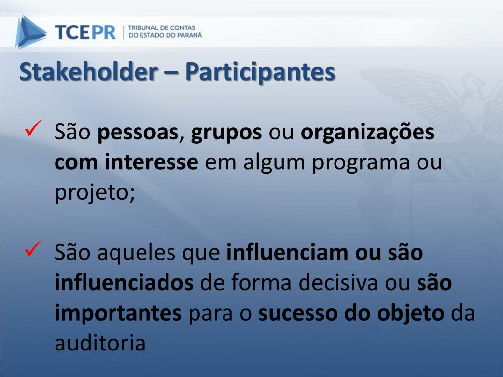 Stakeholder – Participantes • São pessoas, grupos ou organizaçõescom interesse em algum programa ou projeto; • São aqueles que influenciamou são influenciados de forma decisiva ou são importantes para o sucesso do objeto da auditoria