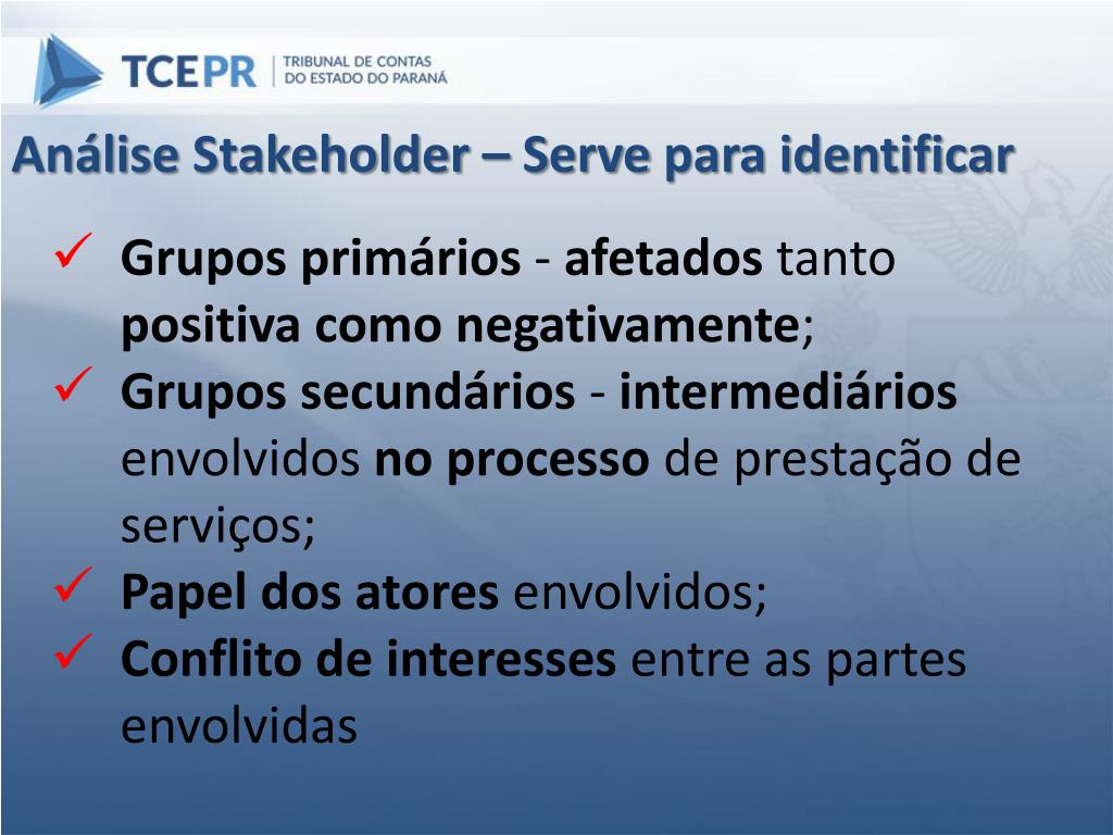 Análise Stakeholder – Serve para identificar • Grupos primários - afetadostanto positiva como negativamente; • Grupos secundários - intermediáriosenvolvidos no processo de prestação de serviços; • Papel dos atores envolvidos; • Conflito de interesses entre as partes envolvidas