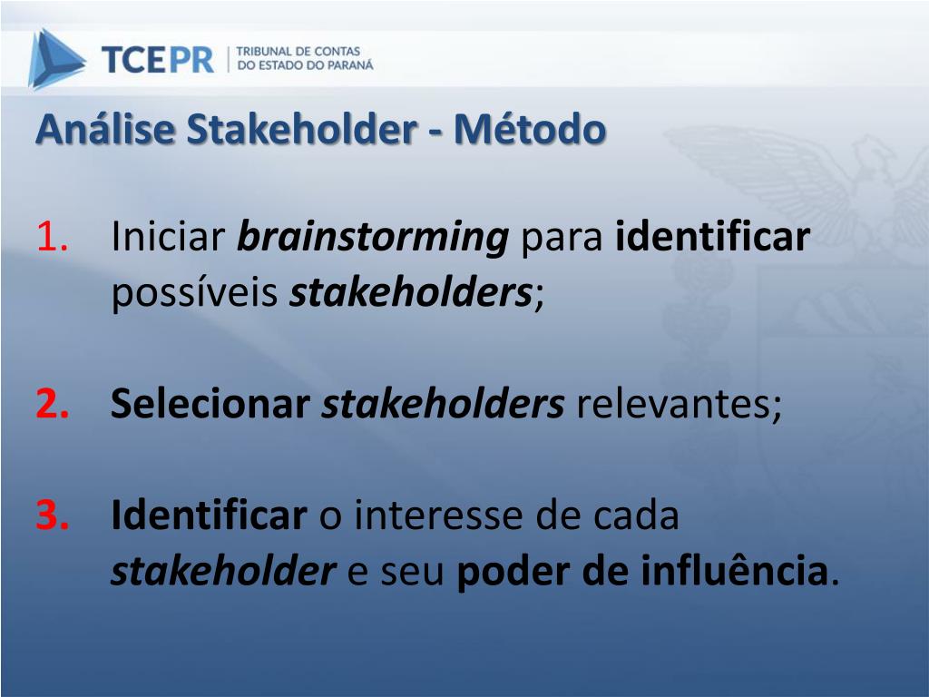 Análise Stakeholder - Método Iniciar brainstormingpara identificar possíveis stakeholders; Selecionar stakeholdersrelevantes; Identificar o interesse de cada stakeholdere seu poder de influência.