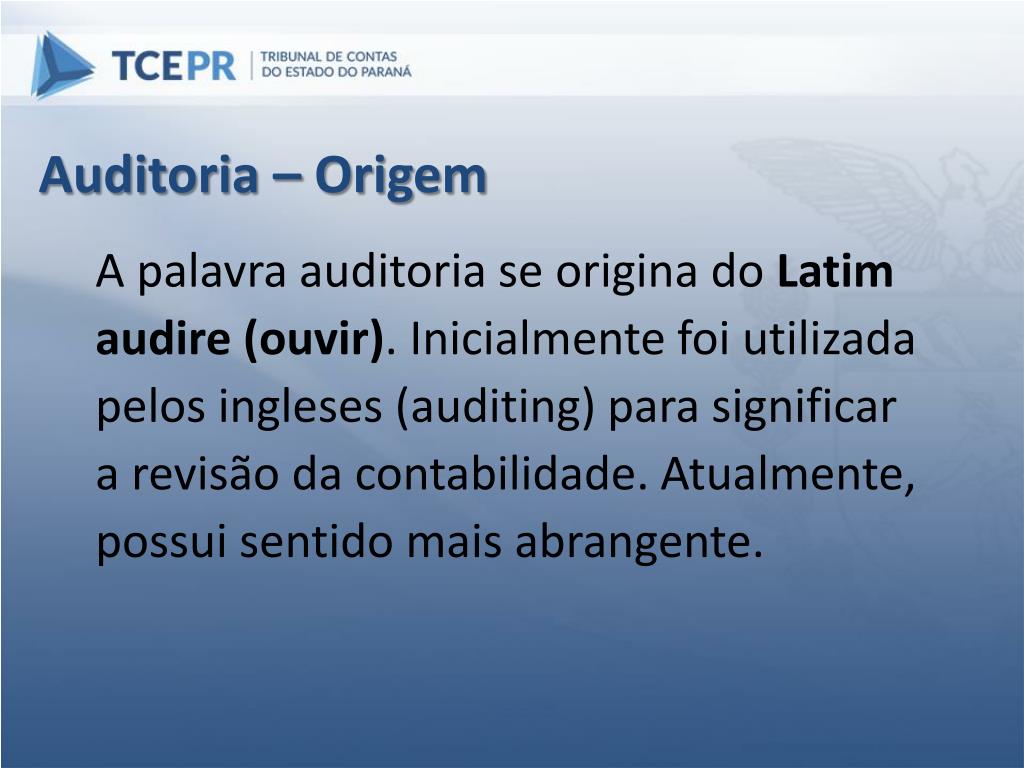 Auditoria – Origem A palavra auditoria se origina do Latim audire (ouvir). Inicialmente foi utilizada pelos ingleses (auditing) para significar a revisão da contabilidade. Atualmente, possui sentido mais abrangente.