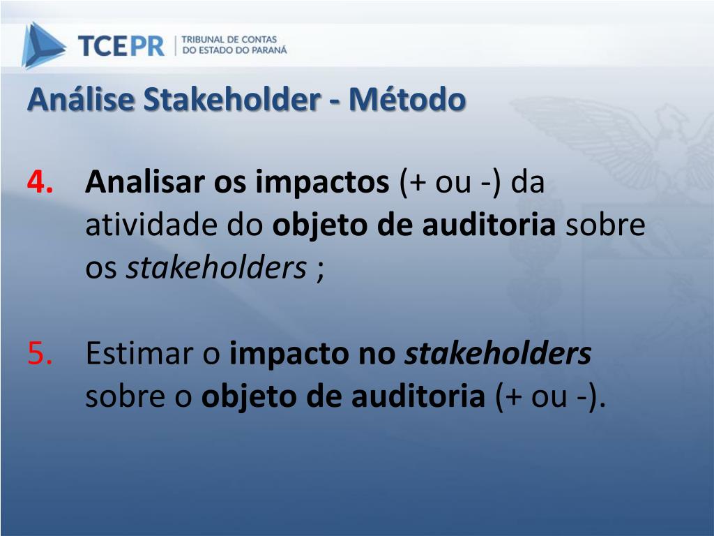Análise Stakeholder - Método Analisar os impactos (+ ou -) da atividade do objeto de auditoria sobre os stakeholders ; Estimar o impacto no stakeholderssobre o objeto de auditoria (+ ou -).