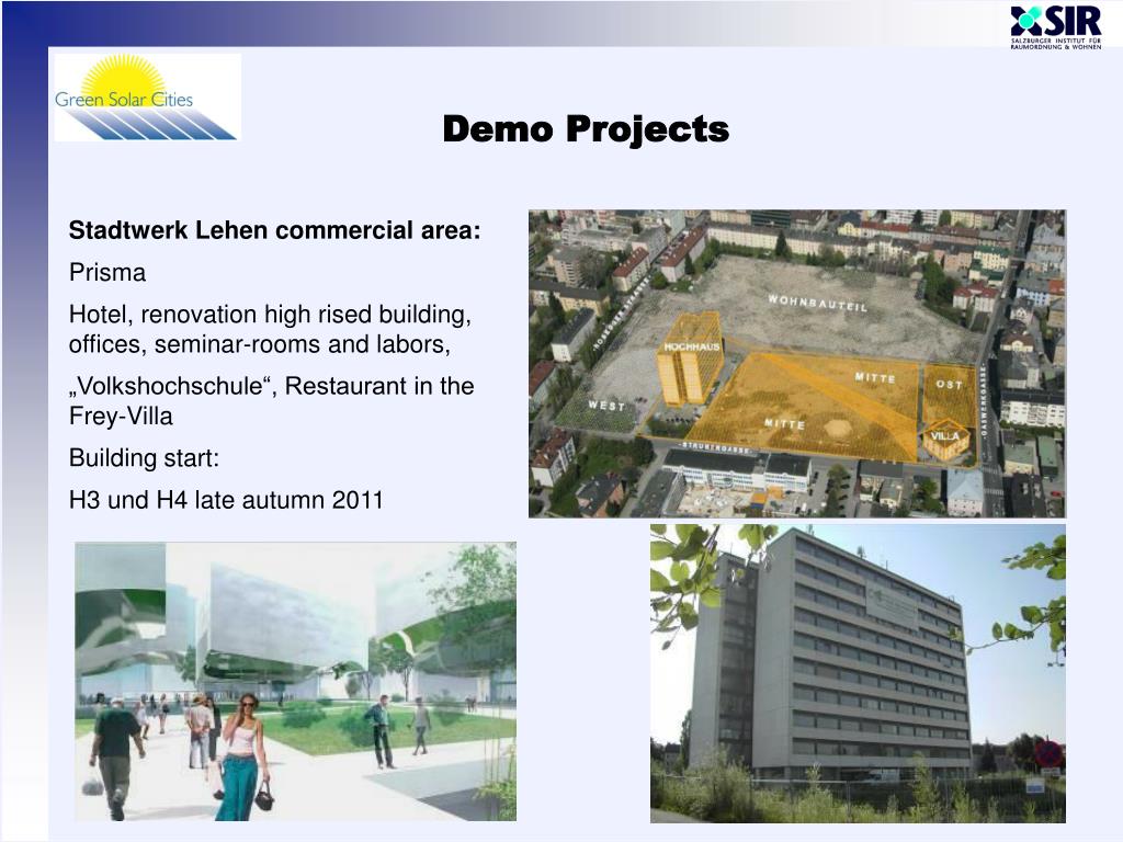Demo Projects Stadtwerk Lehen commercial area: Prisma Hotel, renovation high rised building, offices, seminar-rooms and labors, „Volkshochschule“, Restaurant in the Frey-Villa Building start: H3 und H4 late autumn 2011