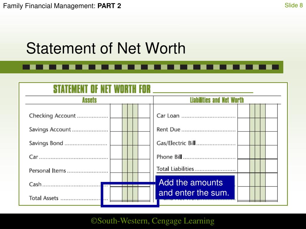 Family Financial Management: PART 2 Statement of Net Worth Calculate net worth by subtracting total liabilities from total assets.