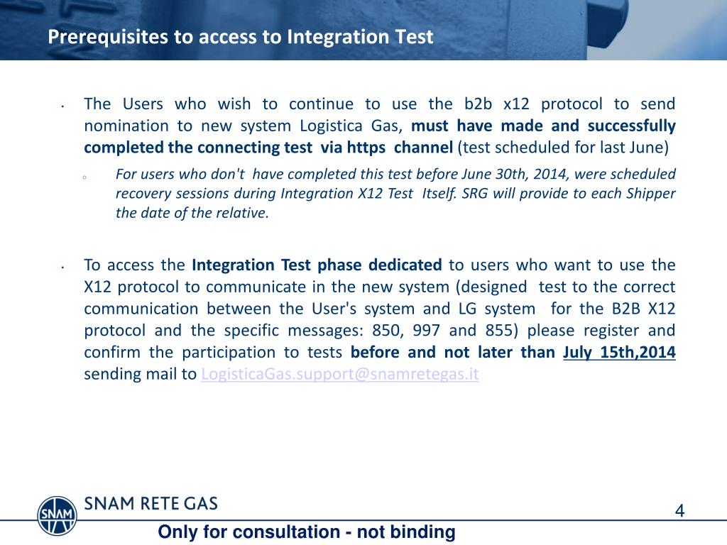 Objective and scope of the Dcument • In addition to the exchanged communications (please see the publications on the website), the objective of this document is to provide details about the reference operating model for the Integration Test scheduled for the the Users' certification to use the B2B and X12 protocol . • In particular the document contains: • Approach to Testing • Test Book • Operating Details • Please see also «Technical Specification».doc for further details . 3 • Only for consultation - not binding