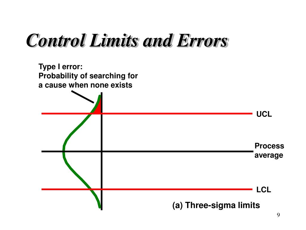 Control Limits and Errors Type I error: Probability of searching for a cause when none exists UCL Process average LCL (a) Three-sigma limits