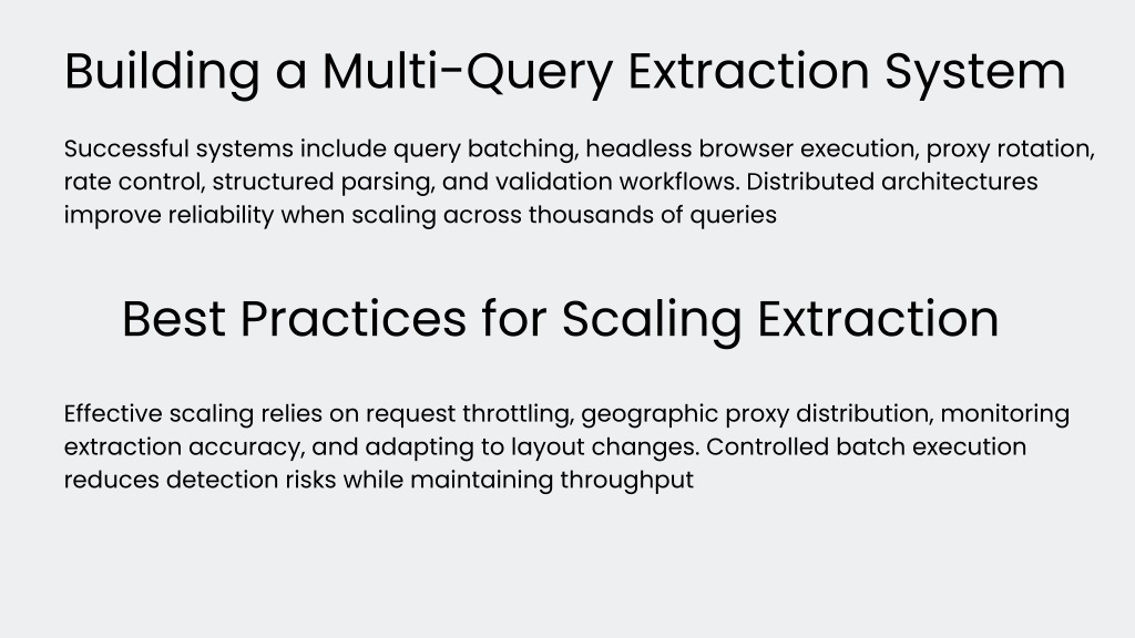 Building a Multi-Query Extraction System Successful systems include query batching, headless browser execution, proxy rotation, rate control, structured parsing, and validation workflows. Distributed architectures improve reliability when scaling across thousands of queries Best Practices for Scaling Extraction Effective scaling relies on request throttling, geographic proxy distribution, monitoring extraction accuracy, and adapting to layout changes. Controlled batch execution reduces detection risks while maintaining throughput