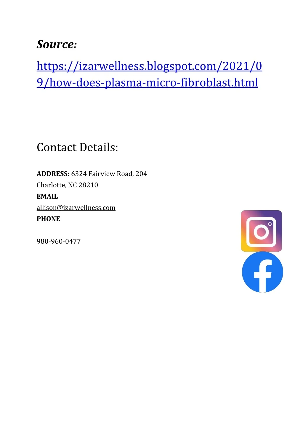 Source: https://izarwellness.blogspot.com/2021/0 9/how-does-plasma-micro-fibroblast.html Contact Details: ADDRESS: 6324 Fairview Road, 204 Charlotte, NC 28210 EMAIL allison@izarwellness.com PHONE 980-960-0477