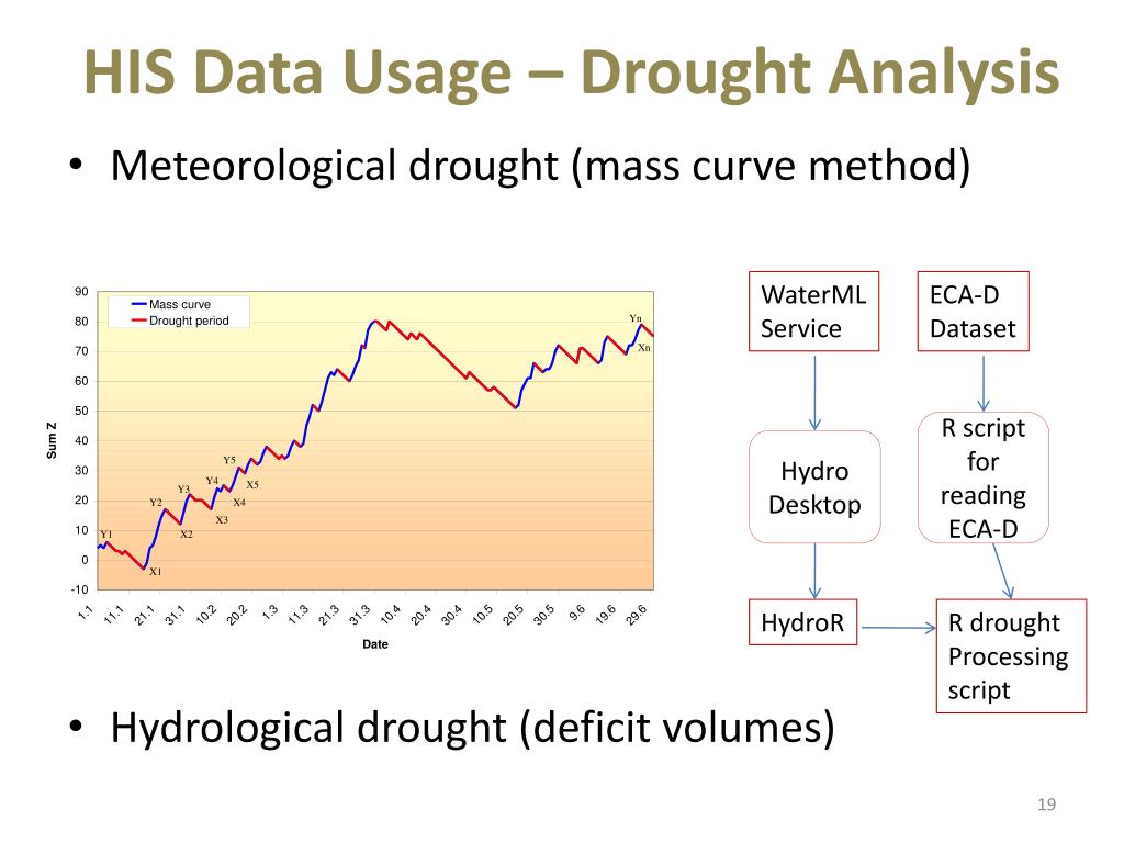 HIS Data Usage – Drought Analysis • Meteorological drought (mass curve method) • Hydrological drought (deficit volumes) WaterML Service ECA-D Dataset R script for reading ECA-D Hydro Desktop HydroR R drought Processing script