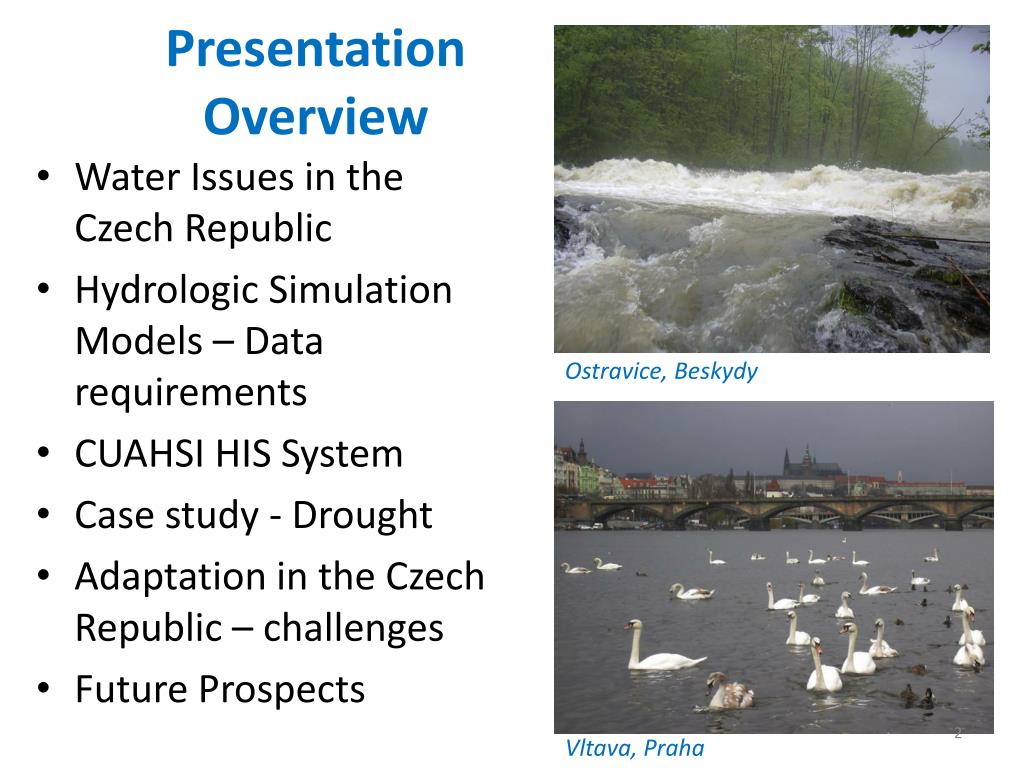 Presentation Overview • Water Issues in the Czech Republic • Hydrologic Simulation Models – Data requirements • CUAHSI HIS System • Case study - Drought • Adaptation in the Czech Republic – challenges • Future Prospects Ostravice, Beskydy Vltava, Praha