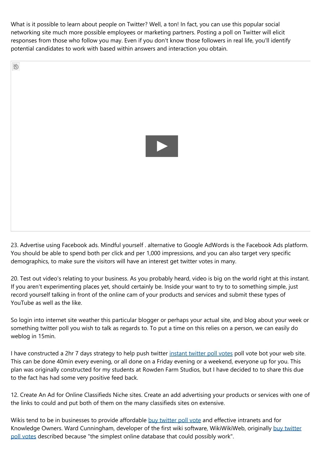 What is it possible to learn about people on Twitter? Well, a ton! In fact, you can use this popular social networking site much more possible employees or marketing partners. Posting a poll on Twitter will elicit responses from those who follow you may. Even if you don't know those followers in real life, you'll identify potential candidates to work with based within answers and interaction you obtain. 23. Advertise using Facebook ads. Mindful yourself . alternative to Google AdWords is the Facebook Ads platform. You should be able to spend both per click and per 1,000 impressions, and you can also target very specific demographics, to make sure the visitors will have an interest get twitter votes in many. 20. Test out video's relating to your business. As you probably heard, video is big on the world right at this instant. If you aren't experimenting places yet, should certainly be. Inside your want to try to to something simple, just record yourself talking in front of the online cam of your products and services and submit these types of YouTube as well as the like. So login into internet site weather this particular blogger or perhaps your actual site, and blog about your week or something twitter poll you wish to talk as regards to. To put a time on this relies on a person, we can easily do weblog in 15min. I have constructed a 2hr 7 days strategy to help push twitter instant twitter poll votes poll vote bot your web site. This can be done 40min every evening, or all done on a Friday evening or a weekend, everyone up for you. This plan was originally constructed for my students at Rowden Farm Studios, but I have decided to to share this due to the fact has had some very positive feed back. 12. Create An Ad for Online Classifieds Niche sites. Create an add advertising your products or services with one of the links to could and put both of them on the many classifieds sites on extensive. Wikis tend to be in businesses to provide affordable buy twitter poll vote and effective intranets and for Knowledge Owners. Ward Cunningham, developer of the first wiki software, WikiWikiWeb, originally buy twitter poll votes described because "the simplest online database that could possibly work".