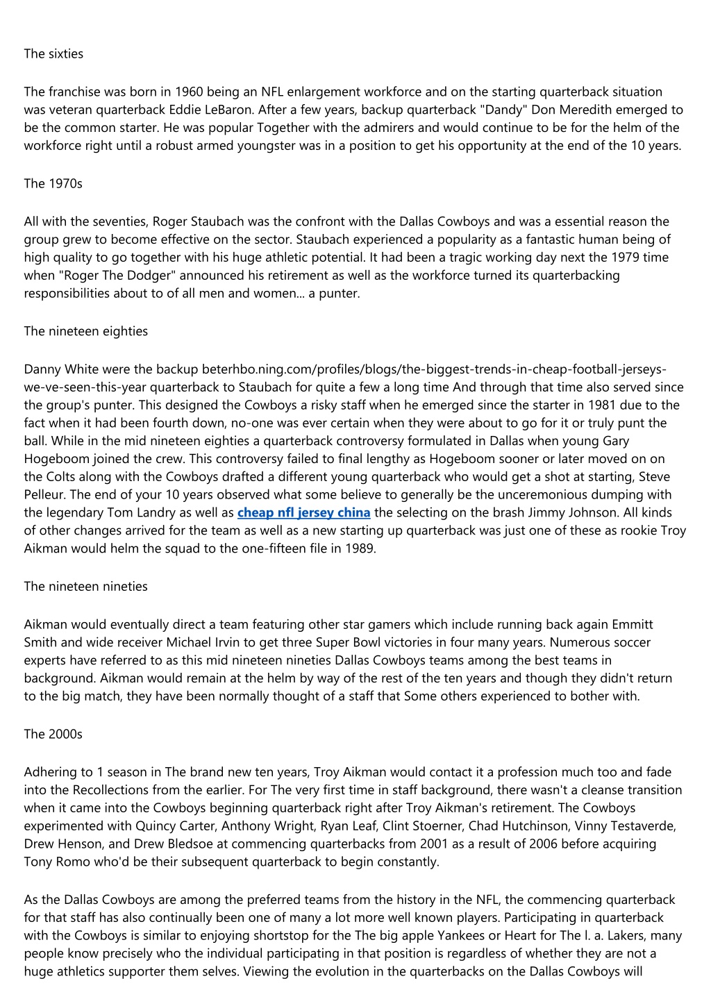 1. The sixties The franchise was born in 1960 being an NFL enlargement workforce and on the starting quarterback situation was veteran quarterback Eddie LeBaron. After a few years, backup quarterback "Dandy" Don Meredith emerged to be the common starter. He was popular Together with the admirers and would continue to be for the helm of the workforce right until a robust armed youngster was in a position to get his opportunity at the end of the 10 years. The 1970s All with the seventies, Roger Staubach was the confront with the Dallas Cowboys and was a essential reason the group grew to become effective on the sector. Staubach experienced a popularity as a fantastic human being of high quality to go together with his huge athletic potential. It had been a tragic working day next the 1979 time when "Roger The Dodger" announced his retirement as well as the workforce turned its quarterbacking responsibilities about to of all men and women... a punter. The nineteen eighties Danny White were the backup beterhbo.ning.com/profiles/blogs/the-biggest-trends-in-cheap-football-jerseys- we-ve-seen-this-year quarterback to Staubach for quite a few a long time And through that time also served since the group's punter. This designed the Cowboys a risky staff when he emerged since the starter in 1981 due to the fact when it had been fourth down, no-one was ever certain when they were about to go for it or truly punt the ball. While in the mid nineteen eighties a quarterback controversy formulated in Dallas when young Gary Hogeboom joined the crew. This controversy failed to final lengthy as Hogeboom sooner or later moved on on the Colts along with the Cowboys drafted a different young quarterback who would get a shot at starting, Steve Pelleur. The end of your 10 years observed what some believe to generally be the unceremonious dumping with the legendary Tom Landry as well as cheap nfl jersey china the selecting on the brash Jimmy Johnson. All kinds of other changes arrived for the team as well as a new starting up quarterback was just one of these as rookie Troy Aikman would helm the squad to the one-fifteen file in 1989. The nineteen nineties Aikman would eventually direct a team featuring other star gamers which include running back again Emmitt Smith and wide receiver Michael Irvin to get three Super Bowl victories in four many years. Numerous soccer experts have referred to as this mid nineteen nineties Dallas Cowboys teams among the best teams in background. Aikman would remain at the helm by way of the rest of the ten years and though they didn't return to the big match, they have been normally thought of a staff that Some others experienced to bother with. The 2000s Adhering to 1 season in The brand new ten years, Troy Aikman would contact it a profession much too and fade into the Recollections from the earlier. For The very first time in staff background, there wasn't a cleanse transition when it came into the Cowboys beginning quarterback right after Troy Aikman's retirement. The Cowboys experimented with Quincy Carter, Anthony Wright, Ryan Leaf, Clint Stoerner, Chad Hutchinson, Vinny Testaverde, Drew Henson, and Drew Bledsoe at commencing quarterbacks from 2001 as a result of 2006 before acquiring Tony Romo who'd be their subsequent quarterback to begin constantly. As the Dallas Cowboys are among the preferred teams from the history in the NFL, the commencing quarterback for that staff has also continually been one of many a lot more well known players. Participating in quarterback with the Cowboys is similar to enjoying shortstop for the The big apple Yankees or Heart for The l. a. Lakers, many people know precisely who the individual participating in that position is regardless of whether they are not a huge athletics supporter them selves. Viewing the evolution in the quarterbacks on the Dallas Cowboys will