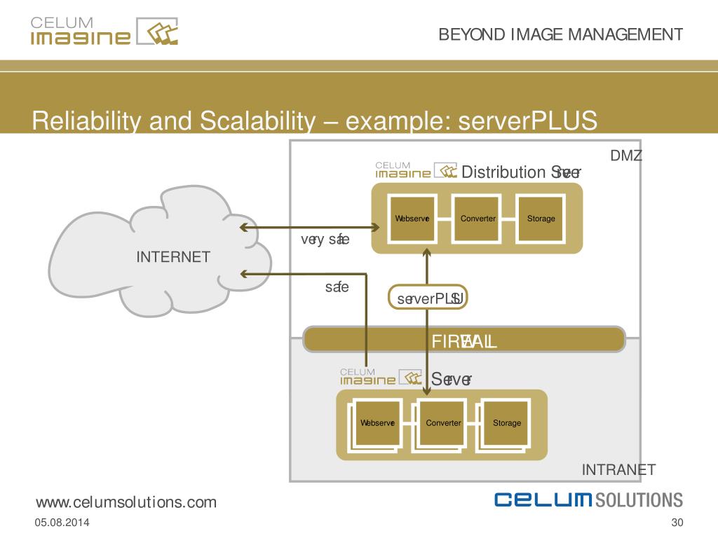 DMZ Distribution Se r ve r W ebserve r Converter Storage ve r y sa f e INTERNET sa f e se r verPLU S FIRE W AL L Se r ve r W ebserve r Converter Storage INTRANET Reliability and Scalability – example: serverPLUS