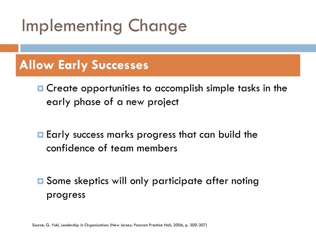 Implementing Change Allow Early Successes • Create opportunities to accomplish simple tasks in the early phase of a new project • Early success marks progress that can build the confidence of team members • Some skeptics will only participate after noting progress Source: G. Yukl, Leadership In Organizations (New Jersey: Pearson Prentice Hall, 2006, p. 300-307)