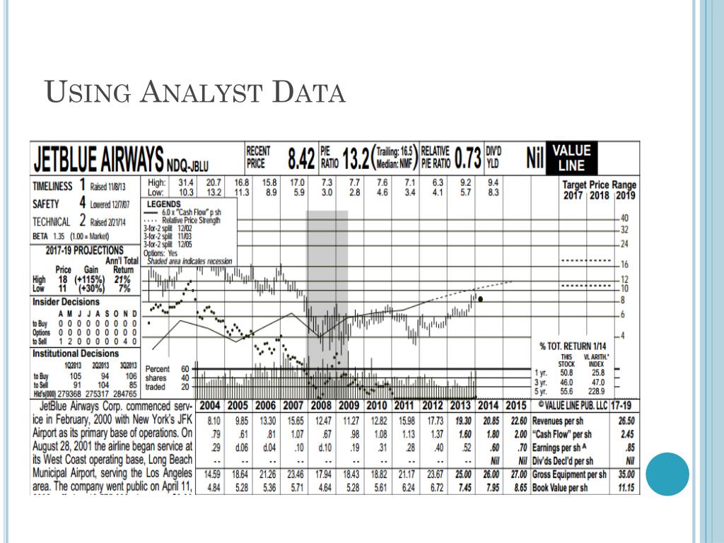 Using Analyst Data • Terminal Value = $14 • Earnings per share are lower in comparison to other analyst estimates • Average: 2014 - .70; 2015 - .80 • High end: 2014 – .80; 2015 – 1.05 • jetBlue does not pay dividends to its shareholders • Therefore cannot use divided discount model to value equity