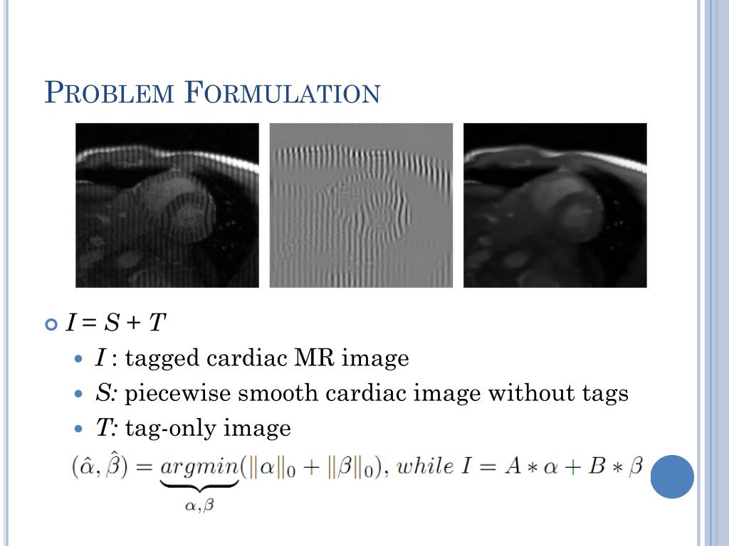 Problem Formulation • I = S + T • I : tagged cardiac MR image • S: piecewise smooth cardiac image without tags • T: tag-only image