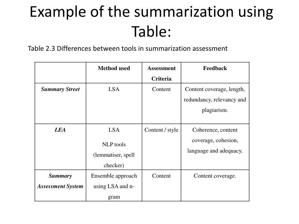 Example of the summarization using Table: Table 2.3 Differences between tools in summarization assessment