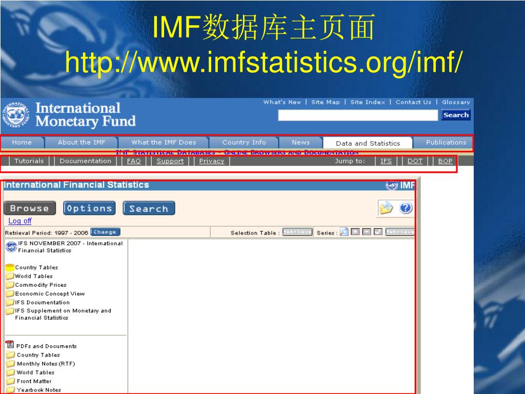 提要 • 国际货币基金组织 • 国际货币基金组织统计数据库背景 • 统计数据库内容和特点 • 产品使用介绍与演示 国际货币基金组织http://www.imfstatistics.org/imf/ 中文网站http://www.imf.org/external/chinese/index.htm