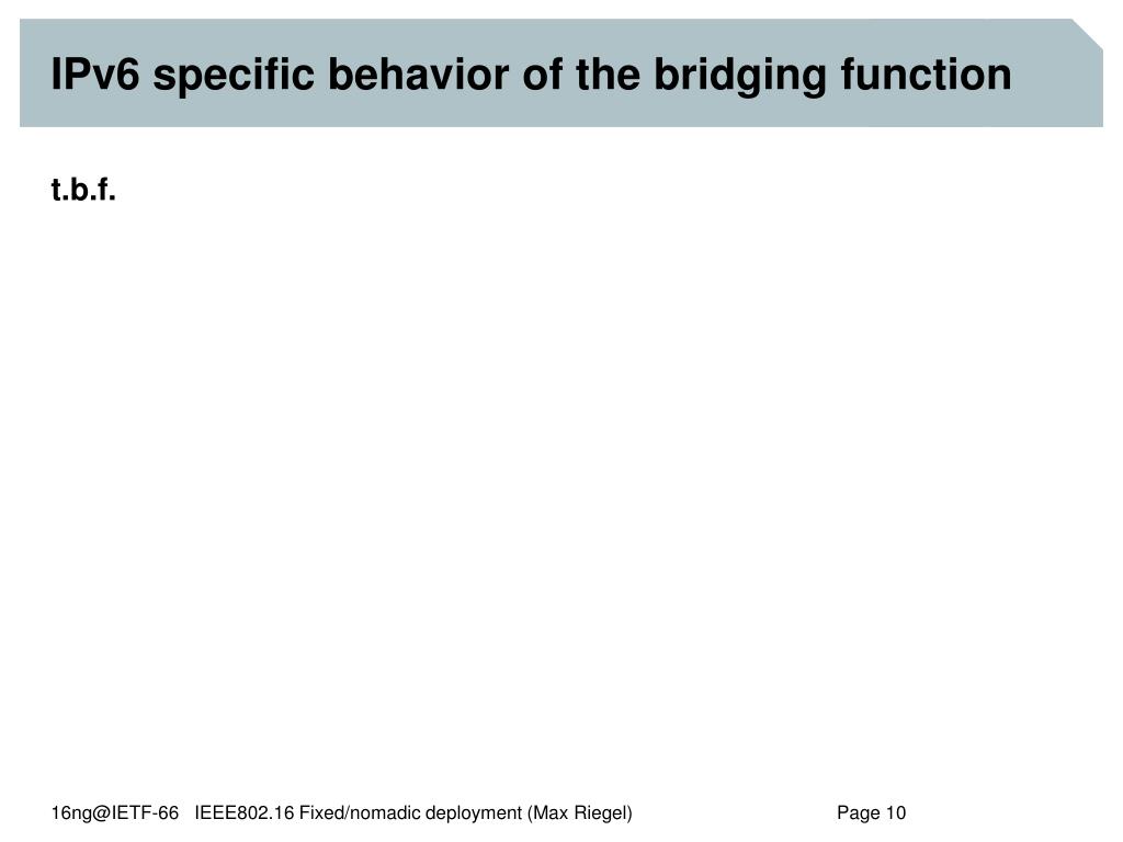 IPv6 specific behavior of the bridging function • t.b.f. 16ng@IETF-66 IEEE802.16 Fixed/nomadic deployment (Max Riegel) Page 10