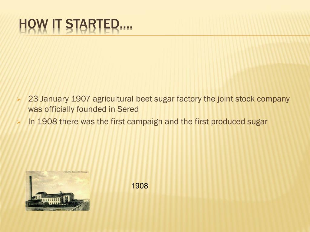 Howitstarted.... • 23 January 1907 agricultural beet sugar factory the joint stock company was officially founded in Sered • In 1908 there was the first campaign and the first produced sugar 1908