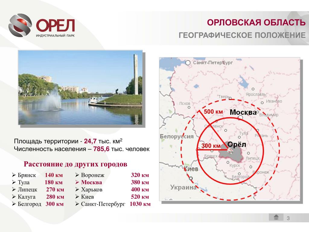 ОРЛОВСКАЯ ОБЛАСТЬГЕОГРАФИЧЕСКОЕ ПОЛОЖЕНИЕ 500 км Площадь территории - 24,7 тыс. км2 Численность населения – 785,6 тыс. человек 300 км Расстояние до других городов • Брянск 140 км • Тула 180 км • Липецк 270 км • Калуга 280 км • Белгород300 км • Воронеж 320 км • Москва380 км • Харьков400 км • Киев520 км • Санкт-Петербург1030 км 3