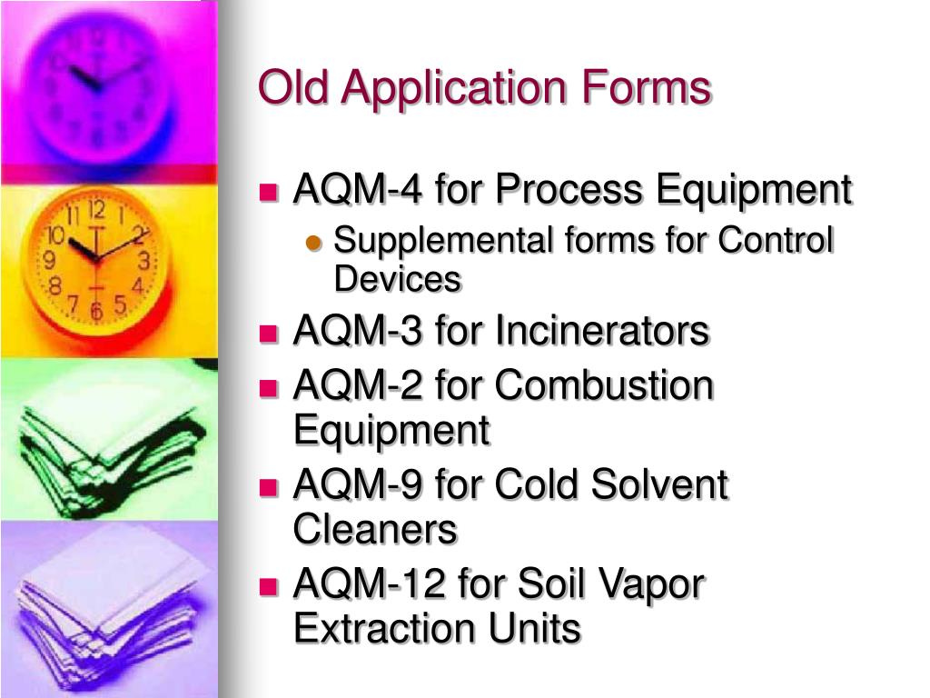Old Application Forms • AQM-4 for Process Equipment • Supplemental forms for Control Devices • AQM-3 for Incinerators • AQM-2 for Combustion Equipment • AQM-9 for Cold Solvent Cleaners • AQM-12 for Soil Vapor Extraction Units