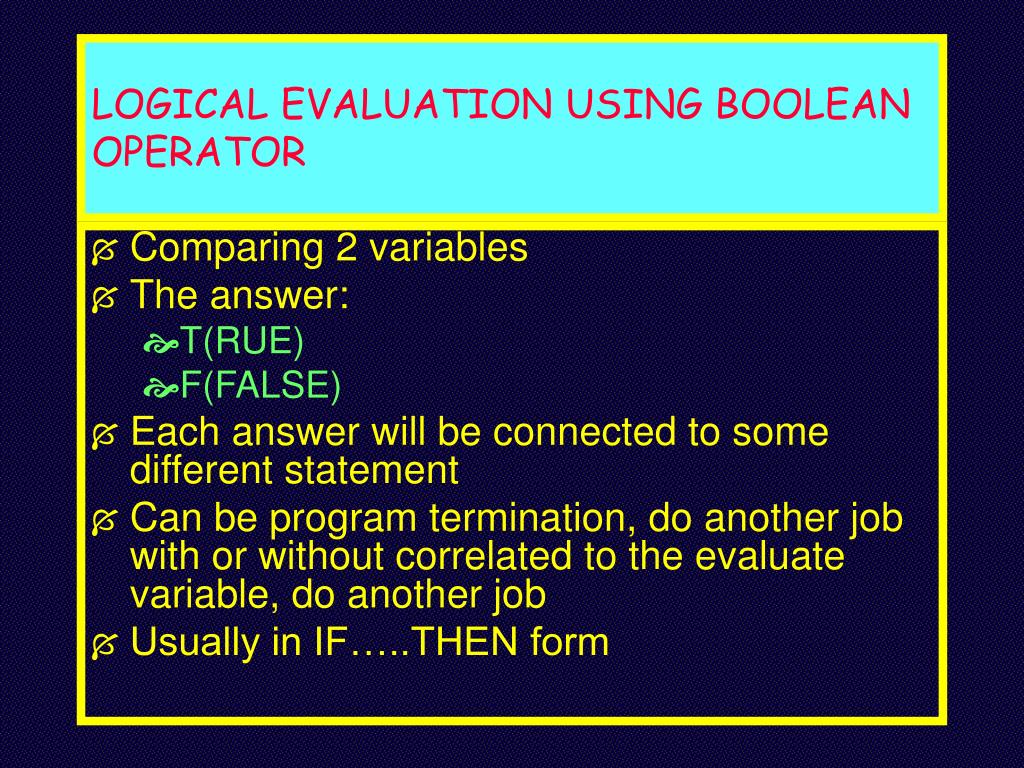 LOGICAL EVALUATION USING BOOLEAN OPERATOR • Comparing 2 variables • The answer: • T(RUE) • F(FALSE) • Each answer will be connected to some different statement • Can be program termination, do another job with or without correlated to the evaluate variable, do another job • Usually in IF…..THEN form