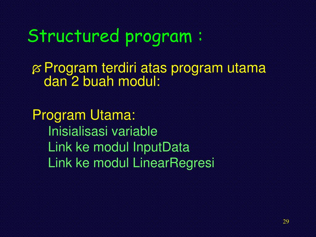 Structured program : • Program terdiri atas program utama dan 2 buah modul: Program Utama: Inisialisasi variable Link ke modul InputData Link ke modul LinearRegresi