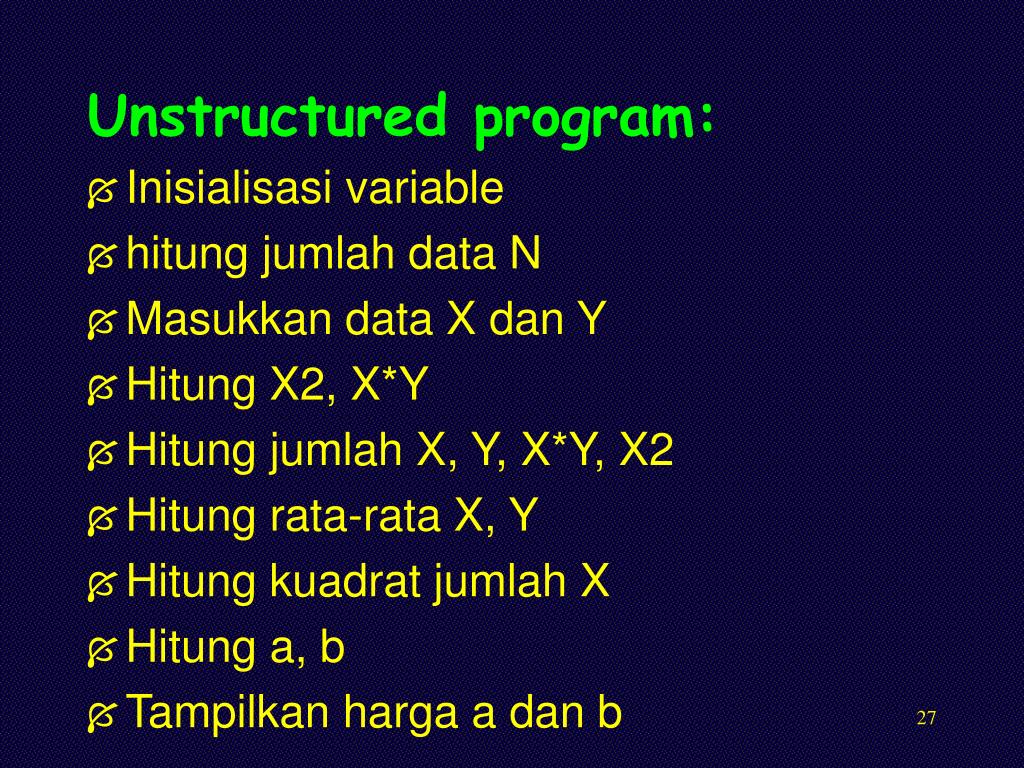 Unstructured program: • Inisialisasi variable • hitung jumlah data N • Masukkan data X dan Y • Hitung X2, X*Y • Hitung jumlah X, Y, X*Y, X2 • Hitung rata-rata X, Y • Hitung kuadrat jumlah X • Hitung a, b • Tampilkan harga a dan b