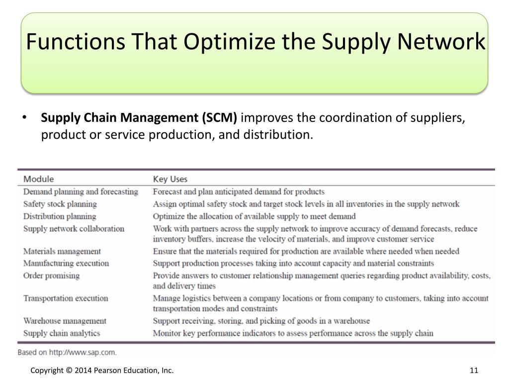 Supply Chain Management (SCM) improves the coordination of suppliers, product or service production, and distribution. Functions That Optimize the Supply Network