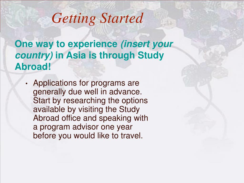 Getting Started One way to experience (insert your country) in Asia is through Study Abroad! • Applications for programs are generally due well in advance. Start by researching the options available by visiting the Study Abroad office and speaking with a program advisor one year before you would like to travel.