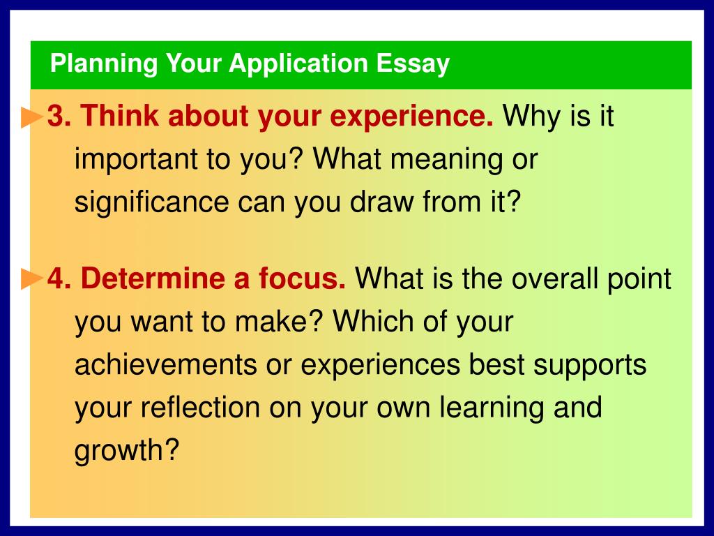 Planning Your Application Essay 3. Think about your experience. Why is it important to you? What meaning or significance can you draw from it? 4. Determine a focus. What is the overall point you want to make? Which of your achievements or experiences best supports your reflection on your own learning and growth?