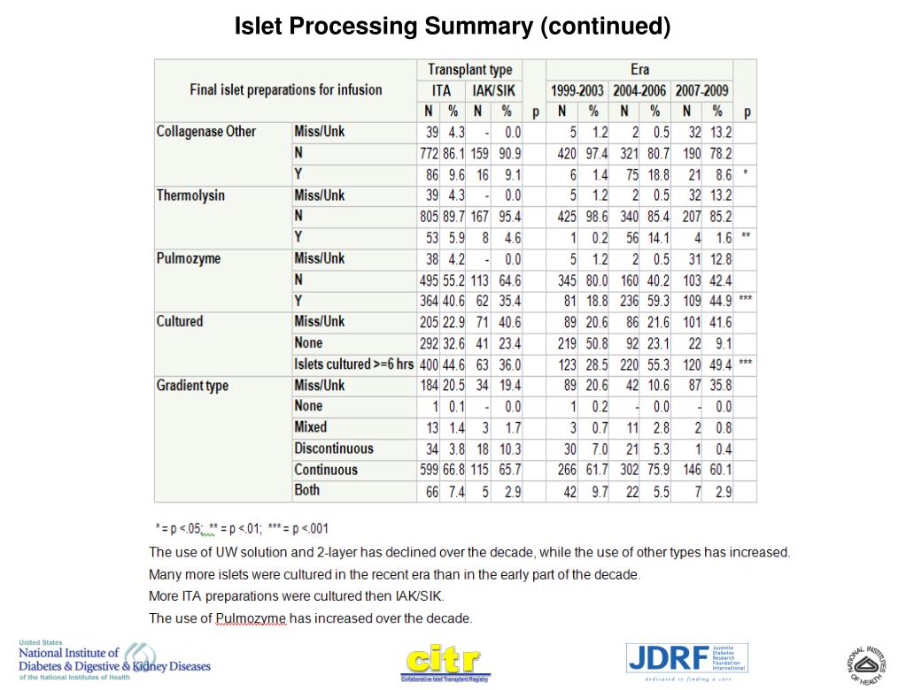 Collaborative Islet Transplant Registry (CITR) 2010 Annual Report Exhibits Prepared by:CITR Coordinating CenterThe EMMES CorporationRockville, MDSponsored by:National Institute of Diabetes & Digestive & Kidney DiseasesNational Institutes of HealthJuvenile Diabetes Research FoundationDatafile Closure: March 21, 2011