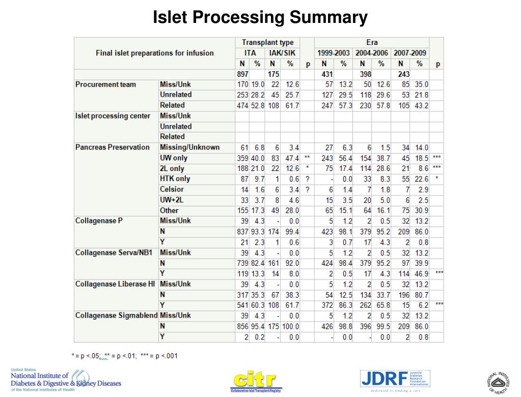Chapter 1: Islet Transplant Activity Chapter 2: Recipient and Donor Characteristics Chapter 3: Pancreas Procurement, Islet Processing, and Infusion Characteristics Chapter 4: Immunosuppression and Other Medications Chapter 5: Graft Function Chapter 6: Liver, Kidney, Lipid, and PRA Effects Chapter 7: Adverse Events Chapter 8: Registry Data Quality Review CITR Coordinating Center CITR Committees Table of Contents