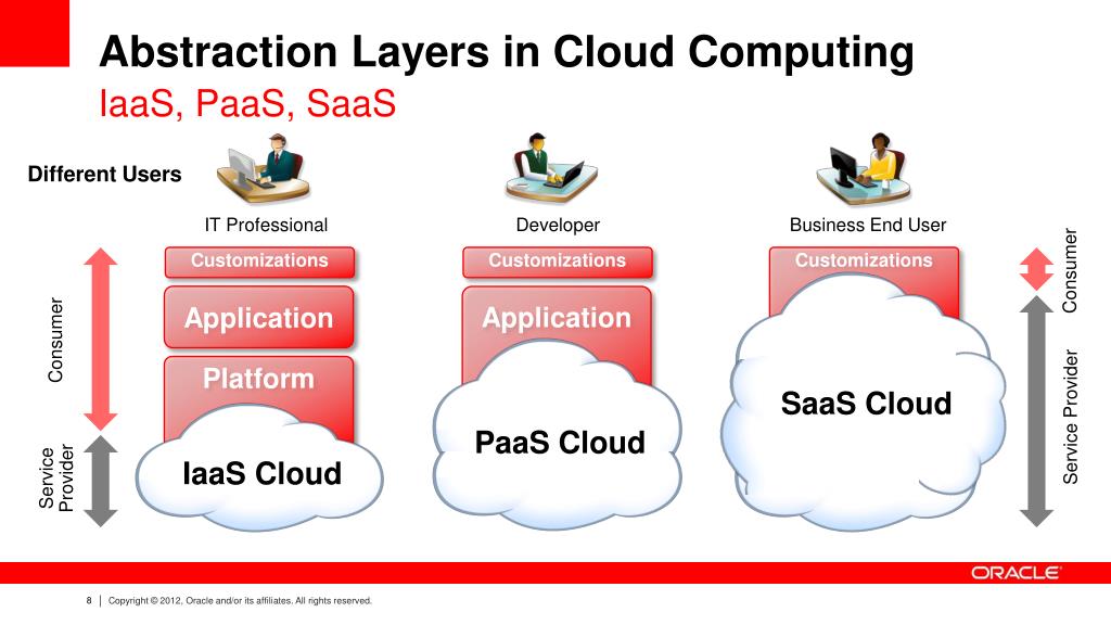 Abstraction Layers in Cloud Computing • IaaS, PaaS, SaaS Different Users IT Professional Developer Business End User Customizations Customizations Customizations Consumer Application Application Consumer Platform SaaS Cloud Service Provider PaaS Cloud IaaS Cloud ServiceProvider