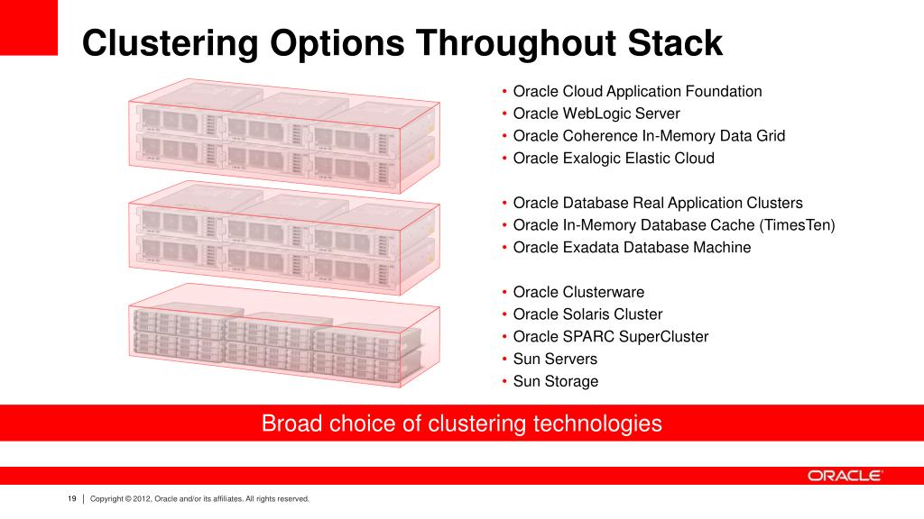 Clustering Options Throughout Stack • Oracle Cloud Application Foundation • Oracle WebLogic Server • Oracle Coherence In-Memory Data Grid • Oracle Exalogic Elastic Cloud • Oracle Database Real Application Clusters • Oracle In-Memory Database Cache (TimesTen) • Oracle Exadata Database Machine • Oracle Clusterware • Oracle Solaris Cluster • Oracle SPARC SuperCluster • Sun Servers • Sun Storage Broad choice of clustering technologies
