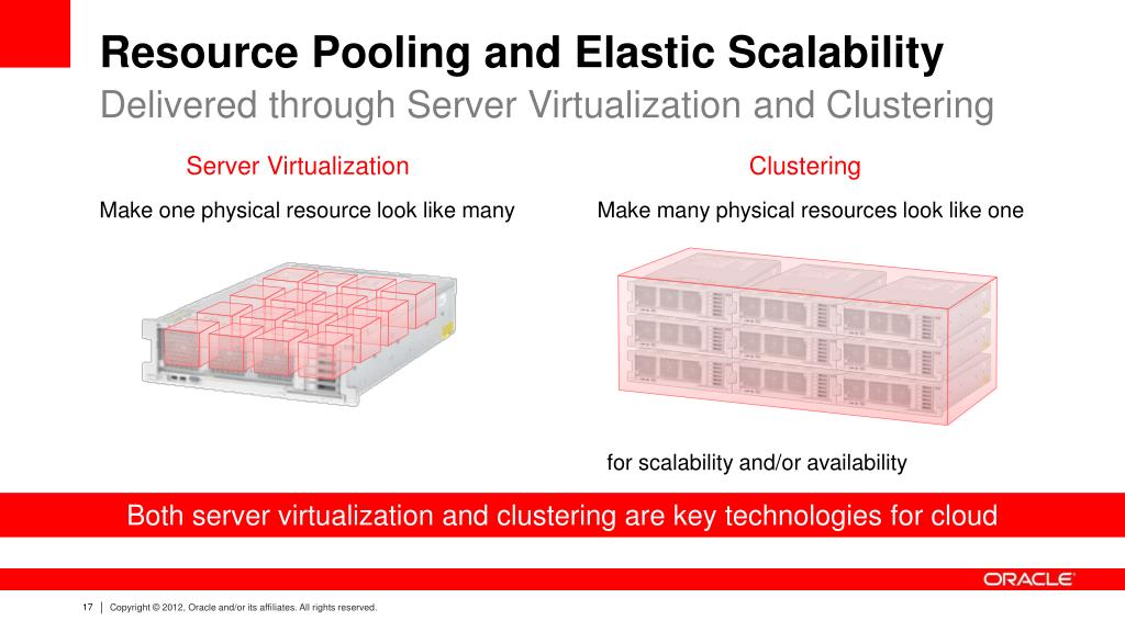 Resource Pooling and Elastic Scalability • Delivered through Server Virtualization and Clustering Server Virtualization Clustering Make one physical resource look like many Make many physical resources look like one for scalability and/or availability Both server virtualization and clustering are key technologies for cloud