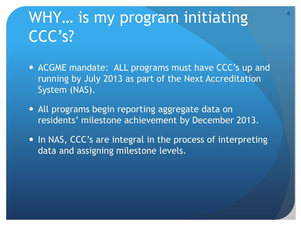 WHY… is my program initiating CCC’s? • ACGME mandate: ALL programs must have CCC’s up and running by July 2013 as part of the Next Accreditation System (NAS). • All programs begin reporting aggregate data on residents’ milestone achievement by December 2013. • In NAS, CCC’s are integral in the process of interpreting data and assigning milestone levels.
