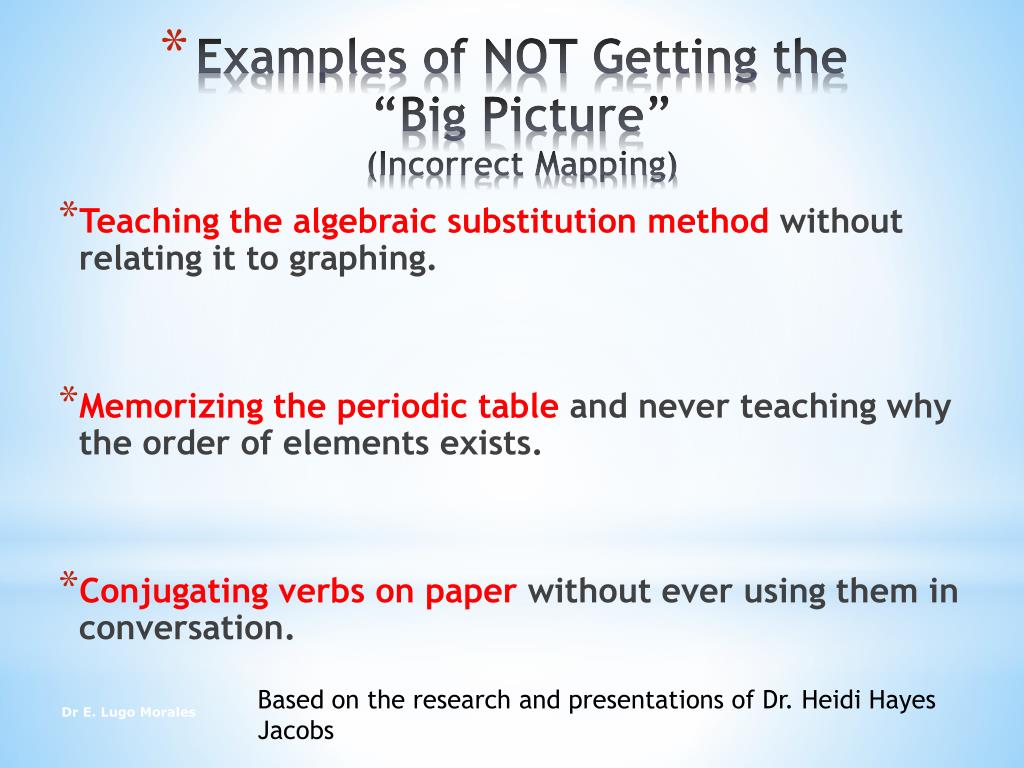 Teaching the algebraic substitution methodwithout relating it to graphing. • Memorizing the periodic table and never teaching why the order of elements exists. • Conjugating verbs on paper without ever using them in conversation. Examples of NOT Getting the “Big Picture” (Incorrect Mapping) Based on the research and presentations of Dr. Heidi Hayes Jacobs Dr E. Lugo Morales