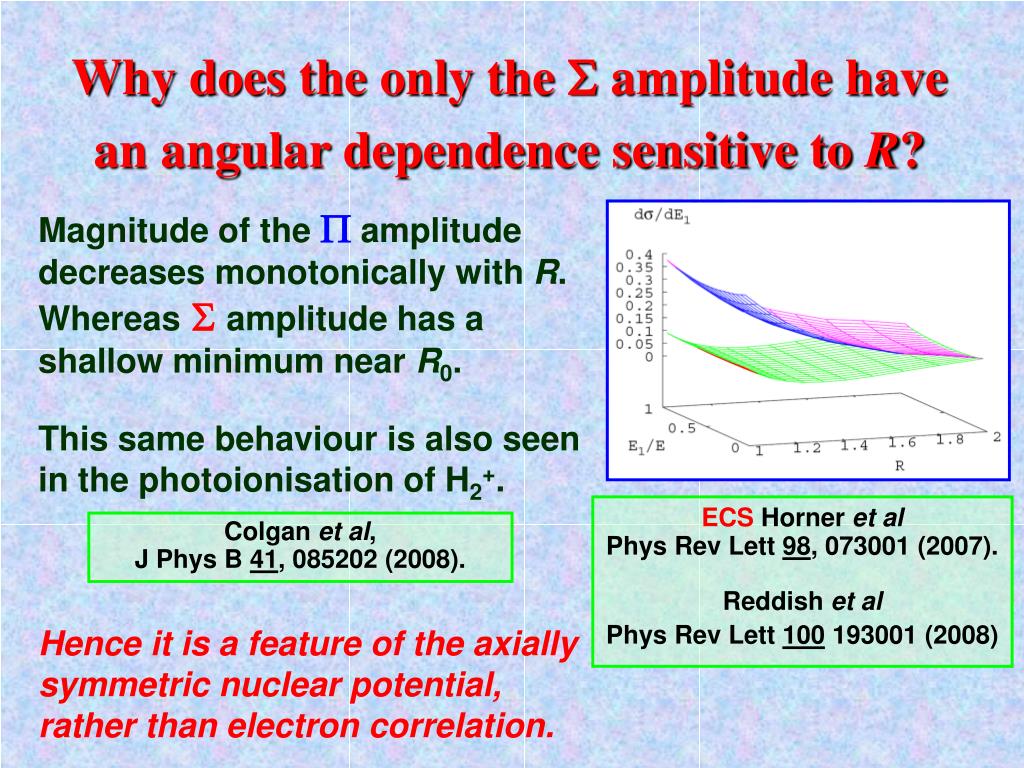 Why does the only the amplitude have an angular dependence sensitive to R? Magnitude of the amplitude decreases monotonically with R. Whereasamplitude has a shallow minimum near R0. This same behaviour is also seen in the photoionisation of H2+. Hence it is a feature of the axially symmetric nuclear potential, rather than electron correlation. ECS Horner et al Phys Rev Lett 98, 073001 (2007). Reddish et al Phys Rev Lett 100 193001 (2008) Colgan et al, J Phys B 41, 085202 (2008).