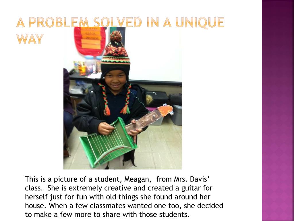 A problem solved in a unique way This is a picture of a student, Meagan, from Mrs. Davis’ class. She is extremely creative and created a guitar for herself just for fun with old things she found around her house. When a few classmates wanted one too, she decided to make a few more to share with those students.