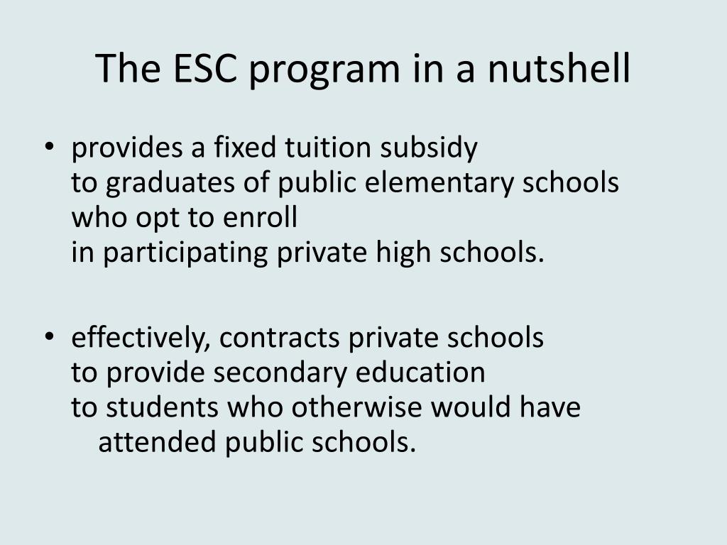 The ESC program in a nutshell • provides a fixed tuition subsidy to graduates of public elementary schools who opt to enroll in participating private high schools. • effectively, contracts private schools to provide secondary education to students who otherwise would have attended public schools.