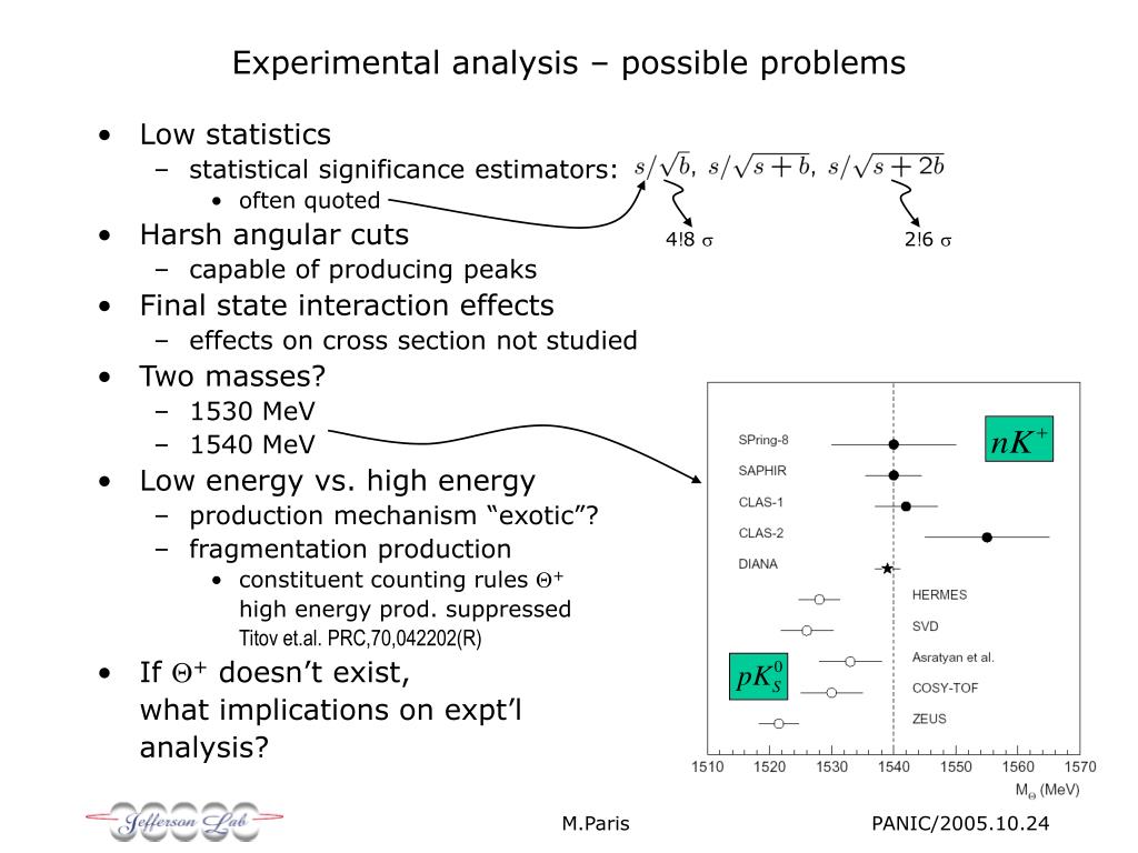 Experimental analysis – possible problems • Low statistics • statistical significance estimators: • often quoted • Harsh angular cuts • capable of producing peaks • Final state interaction effects • effects on cross section not studied • Two masses? • 1530 MeV • 1540 MeV • Low energy vs. high energy • production mechanism “exotic”? • fragmentation production • constituent counting rules + high energy prod. suppressed Titov et.al. PRC,70,042202(R) • If + doesn’t exist, what implications on expt’l analysis? 4!8 2!6 M.Paris PANIC/2005.10.24