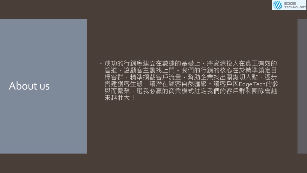 成功的行銷應建立在數據的基礎上,將資源投入在真正有效的管道,讓顧客主動找上門。我們的行銷的核心在於精準鎖定目標客群,精準攔截客戶流量,幫助企業找出關鍵切入點,逐步搭建獲客生態,讓潛在顧客自然匯聚。讓客戶因Edge Tech的參與而繁榮,選我必贏的商業模式註定我們的客戶群和團隊會越來越壯大! About us