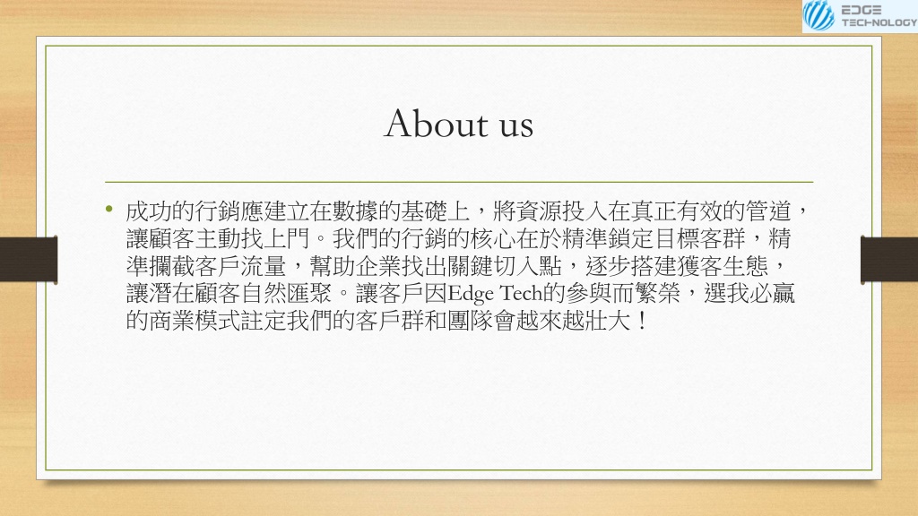 About us • 成功的行銷應建立在數據的基礎上,將資源投入在真正有效的管道,讓顧客主動找上門。我們的行銷的核心在於精準鎖定目標客群,精準攔截客戶流量,幫助企業找出關鍵切入點,逐步搭建獲客生態,讓潛在顧客自然匯聚。讓客戶因Edge Tech的參與而繁榮,選我必贏的商業模式註定我們的客戶群和團隊會越來越壯大!