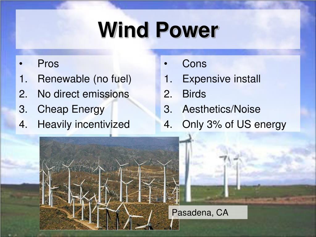 Pros Renewable (no fuel) No direct emissions Cheap Energy Heavily incentivized Cons Expensive install Birds Aesthetics/Noise Only 3% of US energy Wind Power Pasadena, CA