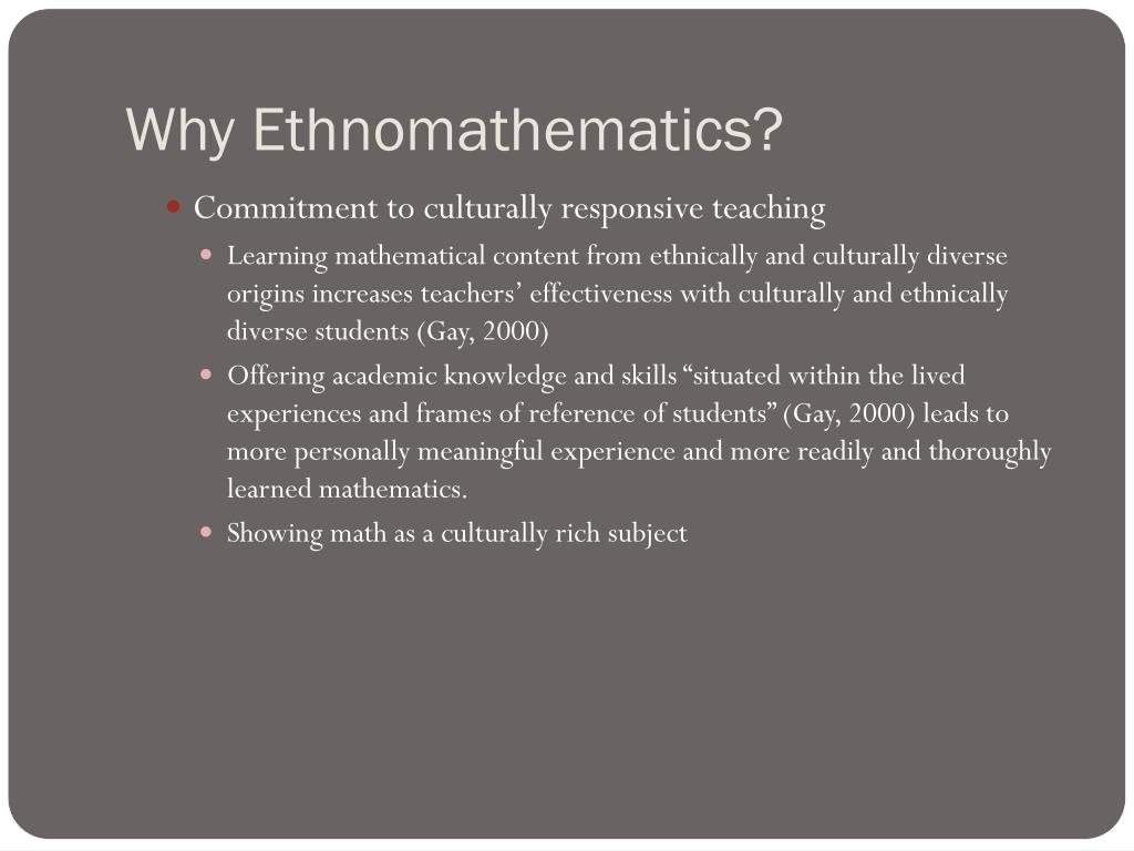 Why Ethnomathematics? • Commitment to culturally responsive teaching • Learning mathematical content from ethnically and culturally diverse origins increases teachers’ effectiveness with culturally and ethnically diverse students (Gay, 2000) • Offering academic knowledge and skills “situated within the lived experiences and frames of reference of students” (Gay, 2000) leads to more personally meaningful experience and more readily and thoroughly learned mathematics. • Showing math as a culturally rich subject