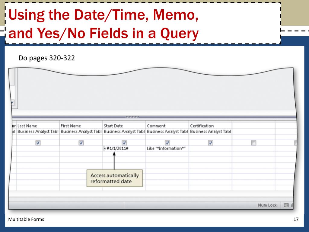 Using the Date/Time, Memo, and Yes/No Fields in a Query Do pages 320-322 Multitable Forms