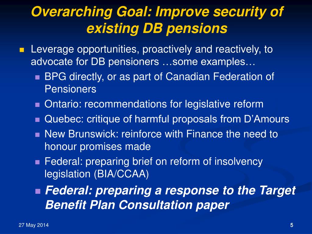 Overarching Goal: Improve security of existing DB pensions • Understand risks to pension security • Business and Pension environment • Legal counsel, actuarial consultation, discussions with Bell • Understand working of government • Political and bureaucracy: the key players and their motivations • Government Relations consultation • Be seen as well-informed, professional player on DB policy • Garner support for pension rules that would reduce risk • Politicians; political staff; government Bureaucrats 4