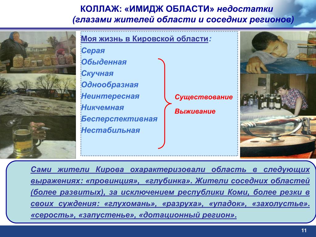 КОЛЛАЖ: «ИМИДЖ ОБЛАСТИ» недостатки(глазами жителей области и соседних регионов) Моя жизнь в Кировской области: Серая Обыденная Скучная Однообразная Неинтересная Никчемная Бесперспективная Нестабильная • Существование • Выживание • Сами жители Кирова охарактеризовали область в следующих выражениях: «провинция», «глубинка». Жители соседних областей (более развитых), за исключением республики Коми, более резки в своих суждения: «глухомань», «разруха», «упадок», «захолустье». «серость», «запустенье», «дотационный регион». 11