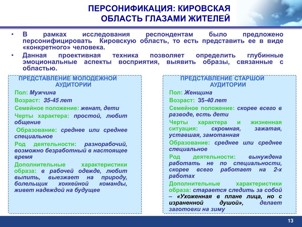 ПЕРСОНИФИКАЦИЯ: КИРОВСКАЯ ОБЛАСТЬ ГЛАЗАМИ ЖИТЕЛЕЙ • В рамках исследования респондентам было предложено персонифицировать Кировскую область, то есть представить ее в виде «конкретного» человека. • Данная проективная техника позволяет определить глубинные эмоциональные аспекты восприятия, выявить образы, связанные с областью. • ПРЕДСТАВЛЕНИЕ МОЛОДЕЖНОЙ АУДИТОРИИ • Пол:Мужчина • Возраст:35-45 лет • Семейное положение:женат, дети • Черты характера:простой, любит общение • Образование:среднее или среднее специальное • Род деятельности:разнорабочий, возможно безработный в настоящее время • Дополнительные характеристики образа:в рабочей одежде, любит выпить, выезжает на природу, болельщик хоккейной команды, живет надеждой на будущее • ПРЕДСТАВЛЕНИЕ СТАРШОЙ АУДИТОРИИ • Пол:Женщина • Возраст: 35-40 лет • Семейное положение:скорее всего в разводе, есть дети • Черты характера и жизненная ситуация:скромная, зажатая, уставшая, замотанная • Образование:среднее или среднее специальное • Род деятельности:вынуждена работать не по специальности, скорее всего работает на 2-х работах • Дополнительные характеристики образа:старается следить за собой – «Ухоженная в плане лица, но с израненной душой», делает заготовки на зиму 13